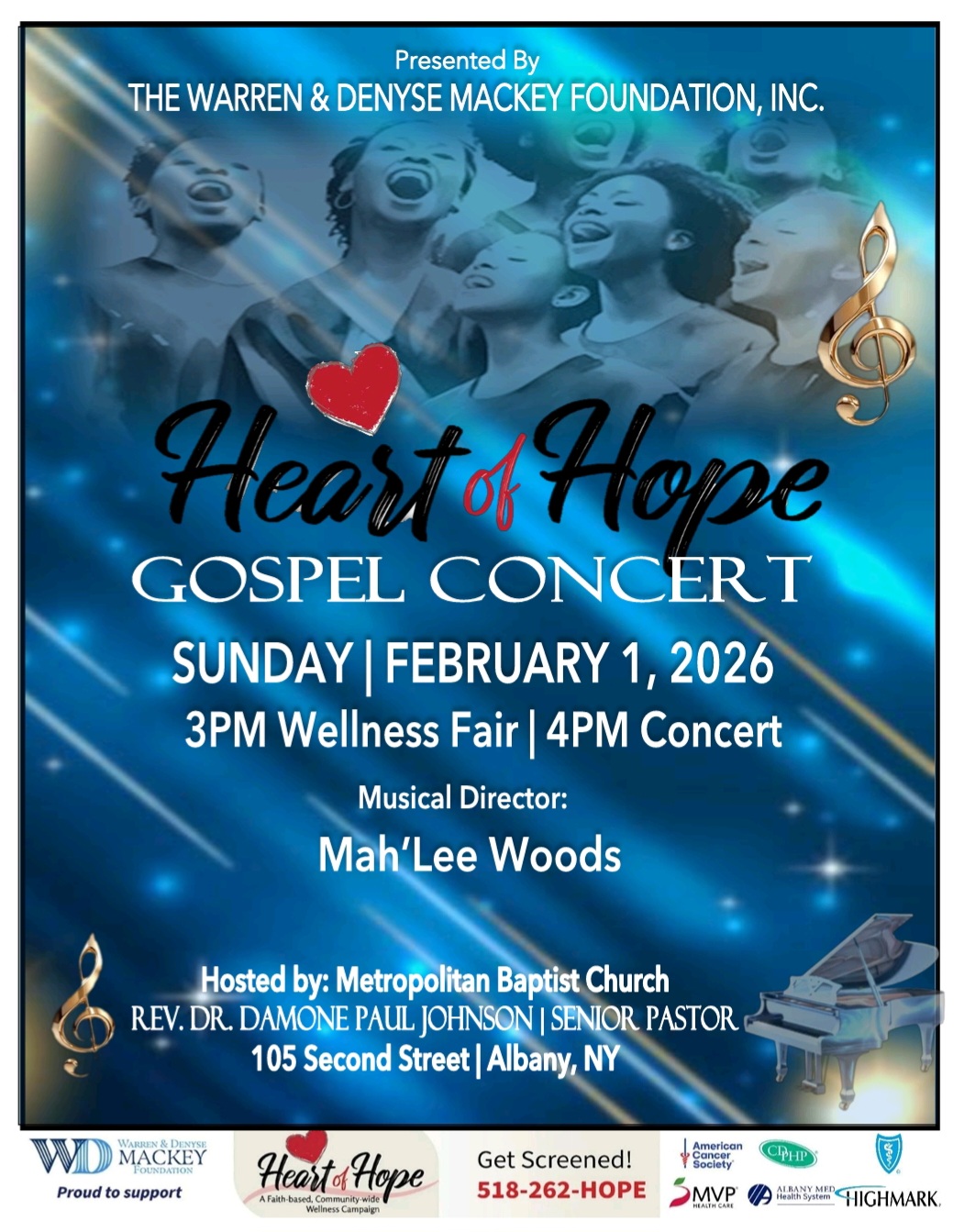 Praise & worship through musical selections celebrating the lives well lived by Warren Mackey, Dennis Lee Edney & Esther Patterson & our own prioritization of health & wellness. Held virtually & in person at MetropolitanBaptist Church Albany NY @ 6 PM.